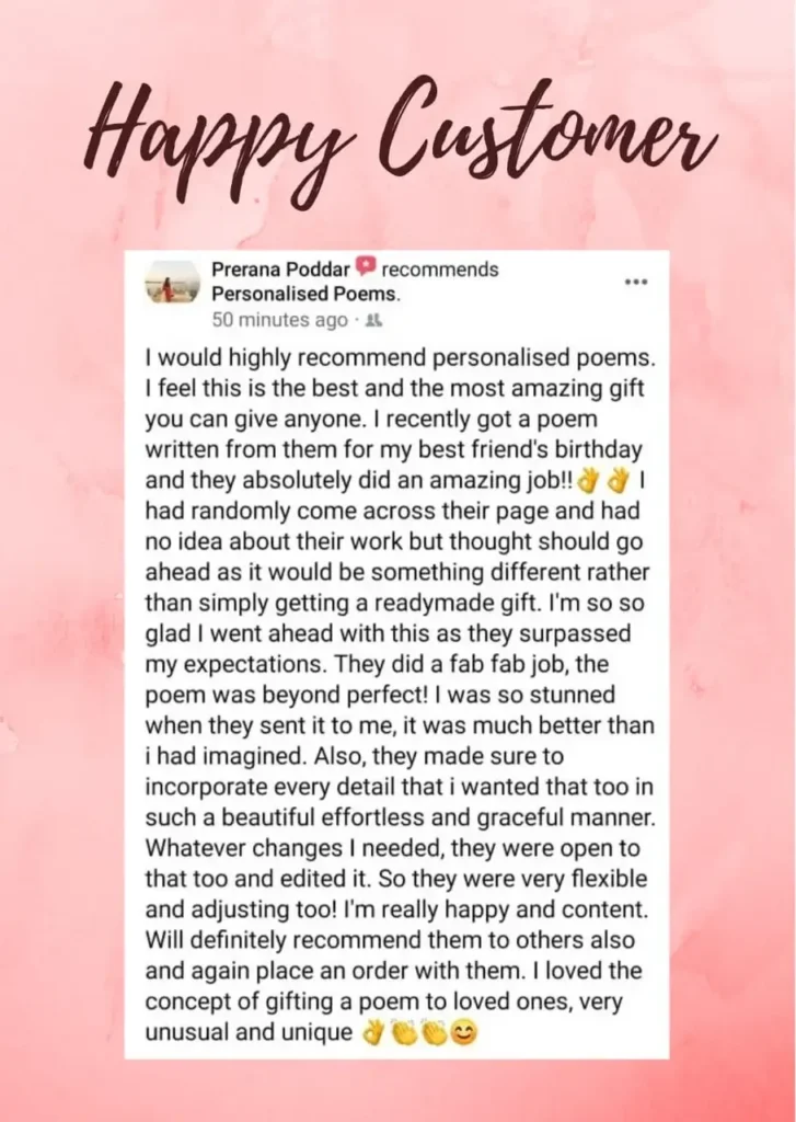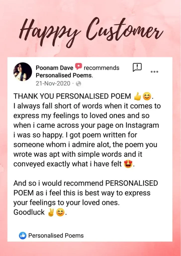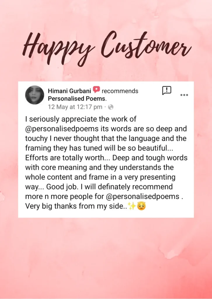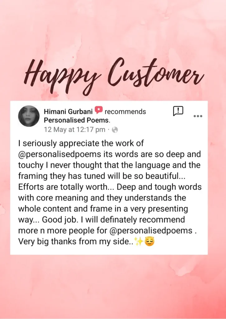 Each poem includes around 14–16 soulful lines, tailored to your story. If you’d like a longer version (28–30 lines), we can do that too, it’s treated as a double poem with additional charges.