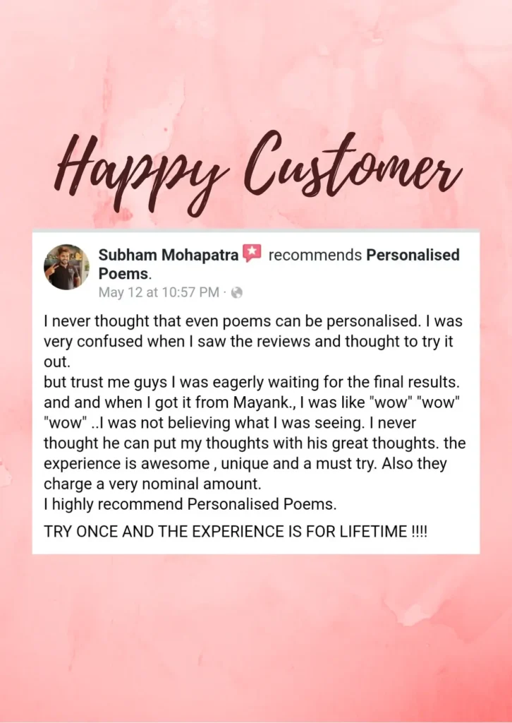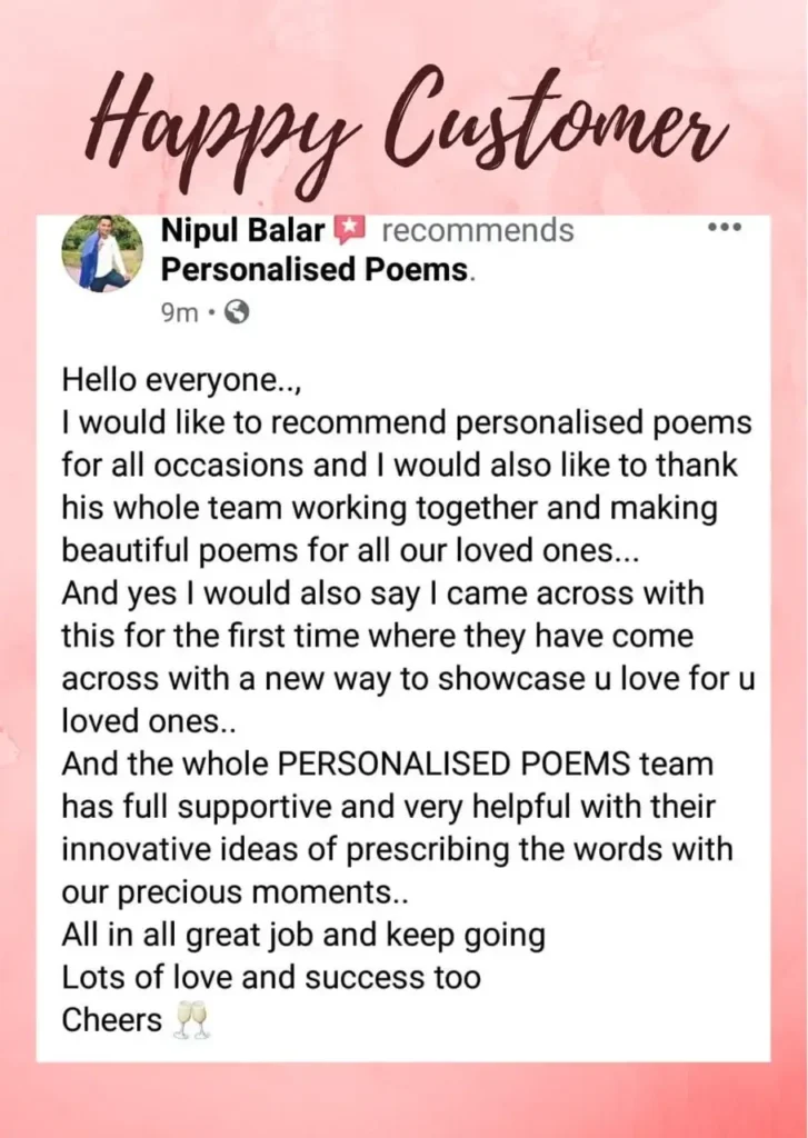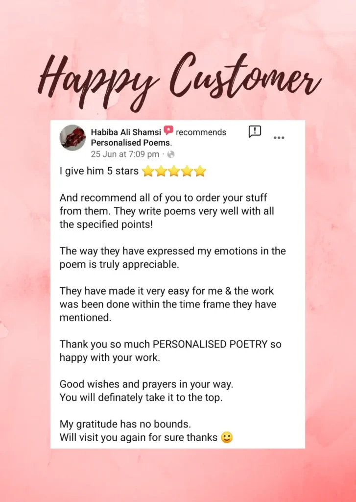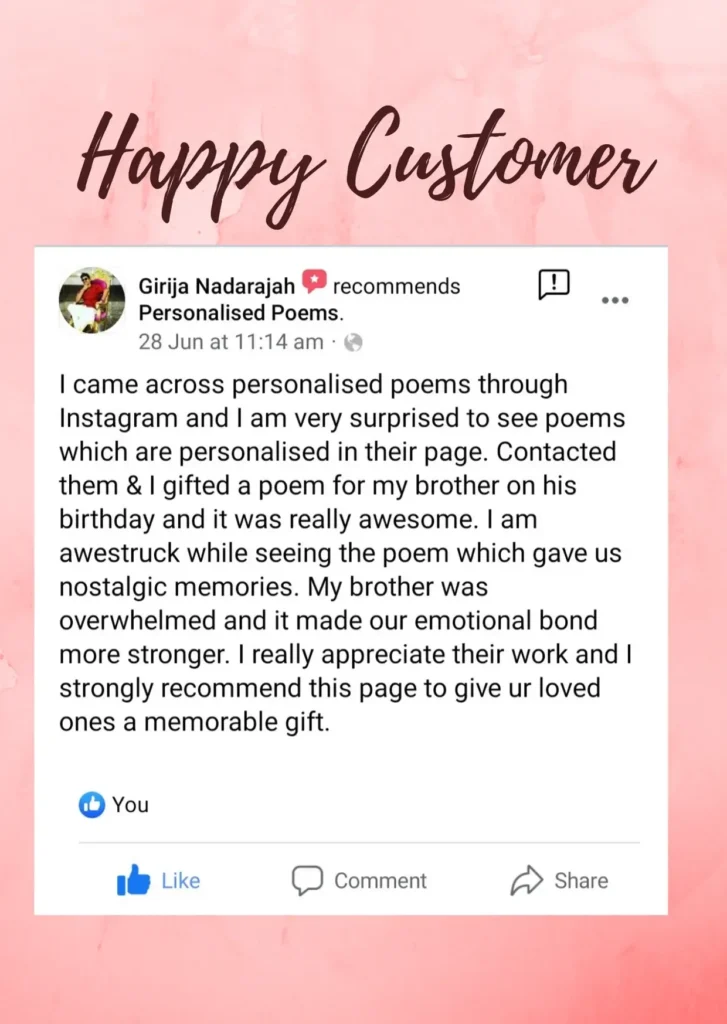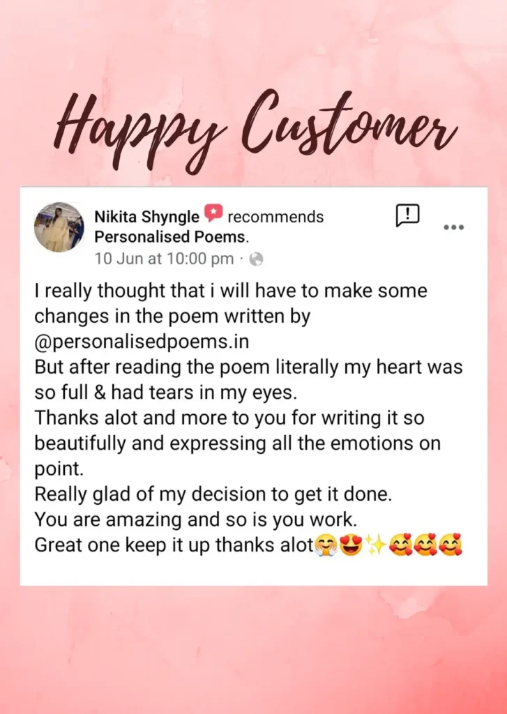 Each poem includes around 14–16 soulful lines, tailored to your story. If you’d like a longer version (28–30 lines), we can do that too, it’s treated as a double poem with additional charges.